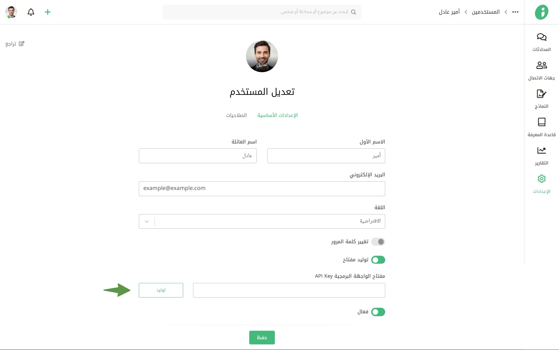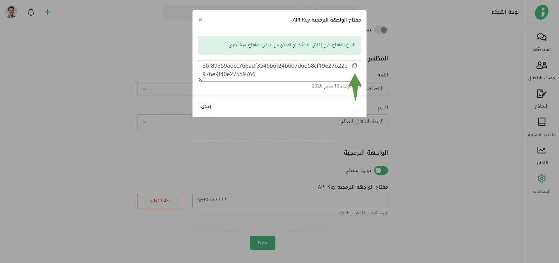 تظهر صفحة إعدادات الحساب، نتأكد من تفعيل خيار توليد مفاتيح الواجهة البرمجية API key، ثم نضغط على زر توليد للحصول على المفتاح كما هو موضح في الصورة التالية: